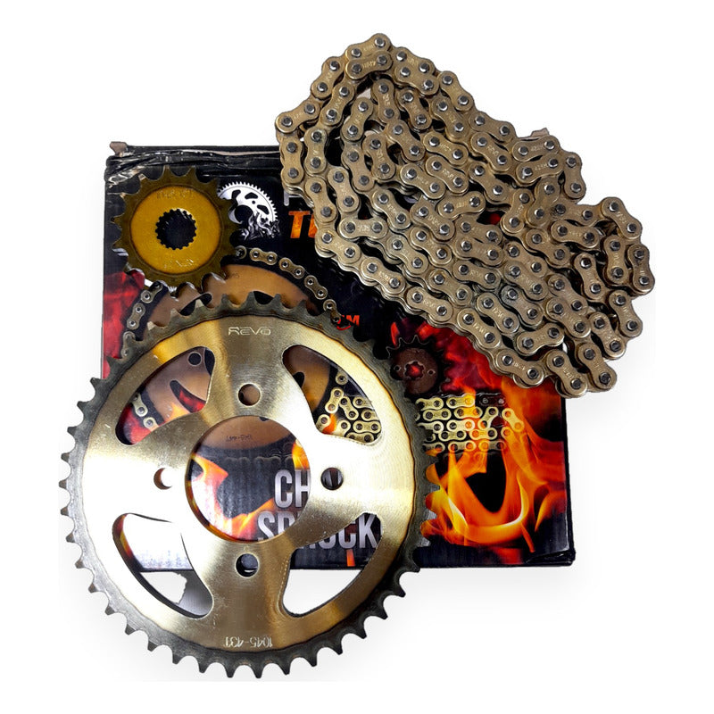 Color: Dorado oscuro Código universal de producto: 1369091897531 Código OEM: YS5018 SKU: YS5018 Marca: Revo Termico Largo de la cadena: 428 cm Cantidad de eslabones de la cadena: 126 Material de la corona: Acero Cantidad de dientes de la corona: 43 Condición del ítem: Nuevo Estilo de conducción en moto: Urbano Origen: China Número de pieza: YS5018 Material del piñón: Acero Cantidad de dientes del piñón: 15